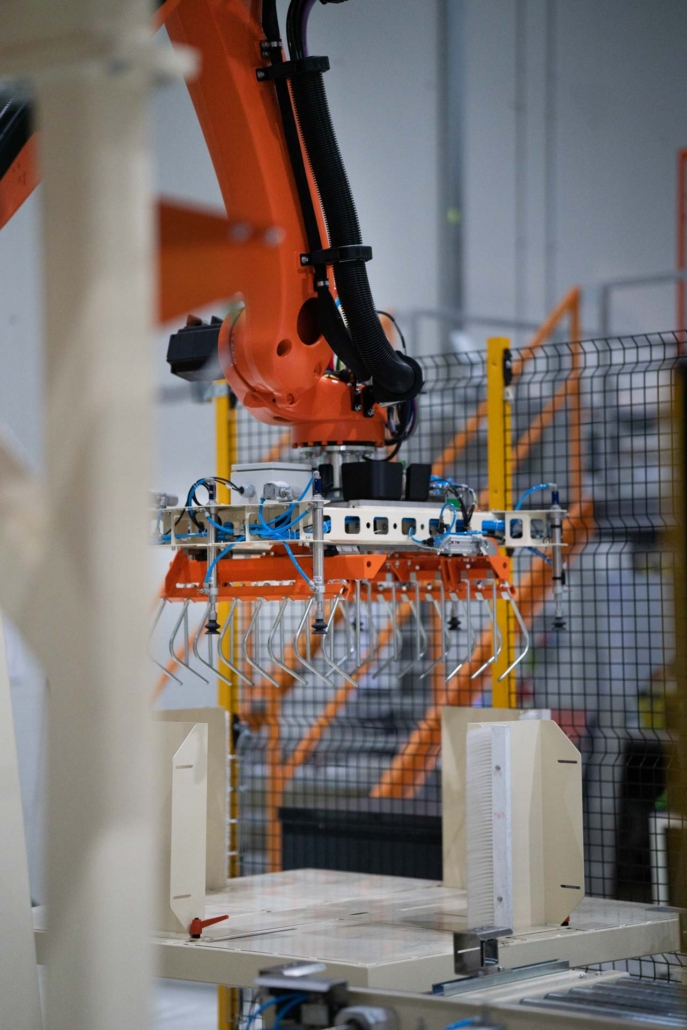 I sacchi, in carta e senza valvola, ma con chiusura stagna per evitare fuoriuscite di aria e contaminazioni del prodotto riempito, hanno richiesto un’approfondita analisi a priori e una serie di test iniziali, che sono stati effettuati su una macchina esistente presso un’ altra fabbrica dello stesso cliente, per valutare, scegliere e proporre la migliore tipologia di movimentazione, che ne garantisse un’operazione gentile di presa e deposito e, allo stesso tempo, un preciso impilamento sui bancali.