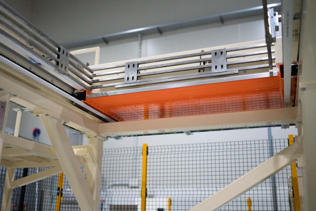 - struttura a telaio per la palettizzazione stabile a filo fisso in quota, completa di piano apribile a basso coefficiente di attrito;