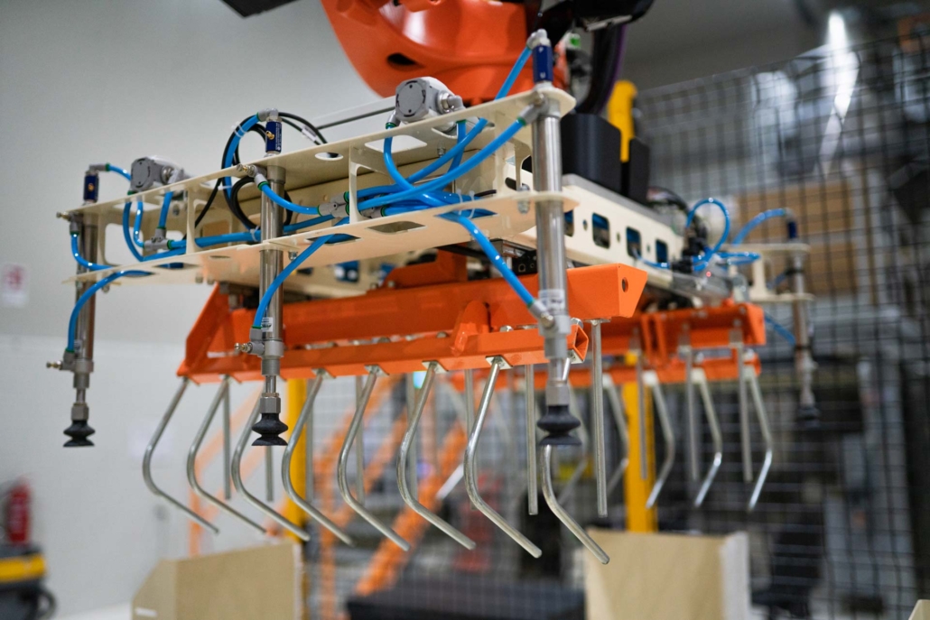 - testa di palettizzazione, montata sul braccio robotico, atta al prelievo e deposito dei sacchi tramite pinza di presa singola, e al prelievo e deposito delle falde mediante ventose, e appositamente studiata per garantire precisione e delicatezza dei movimenti;