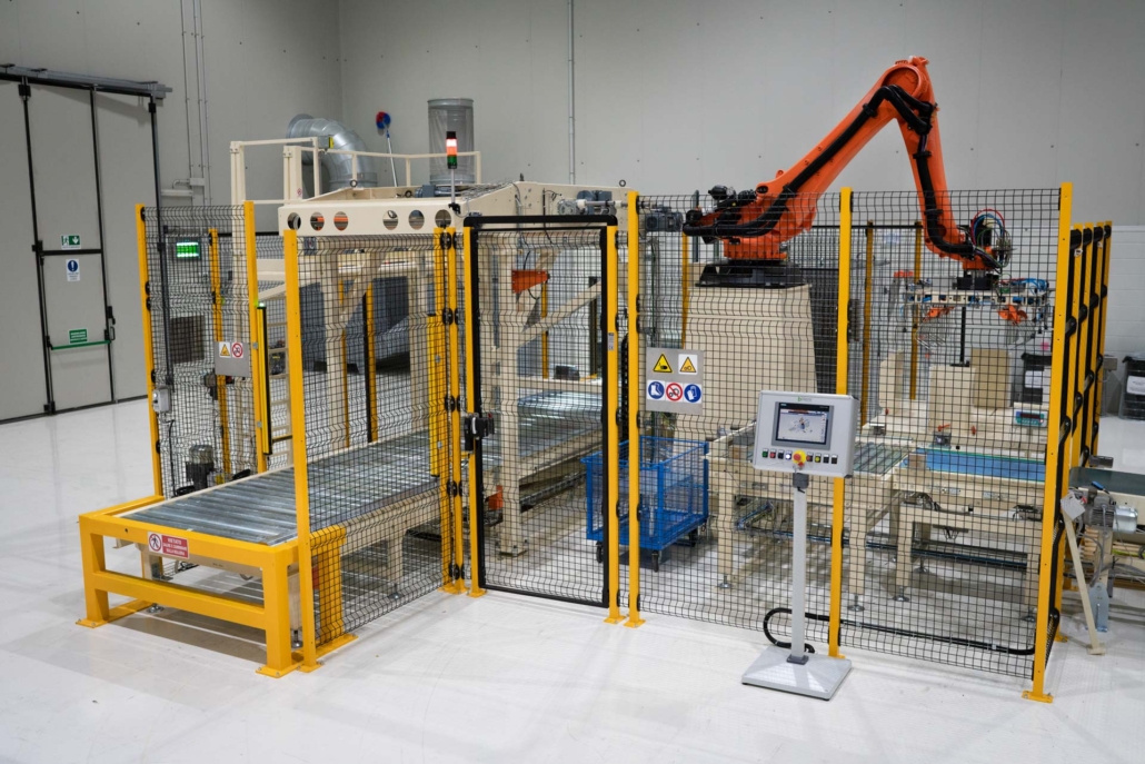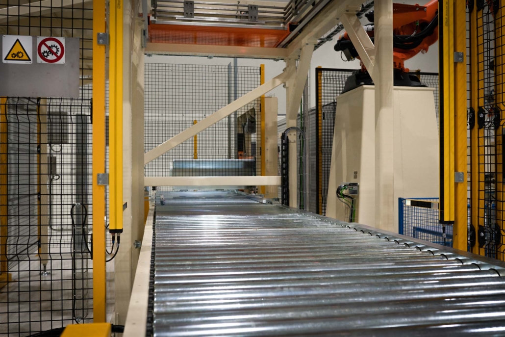 - trasportatori a rulli motorizzati di ingresso palette vuote ed uscita palette piene;