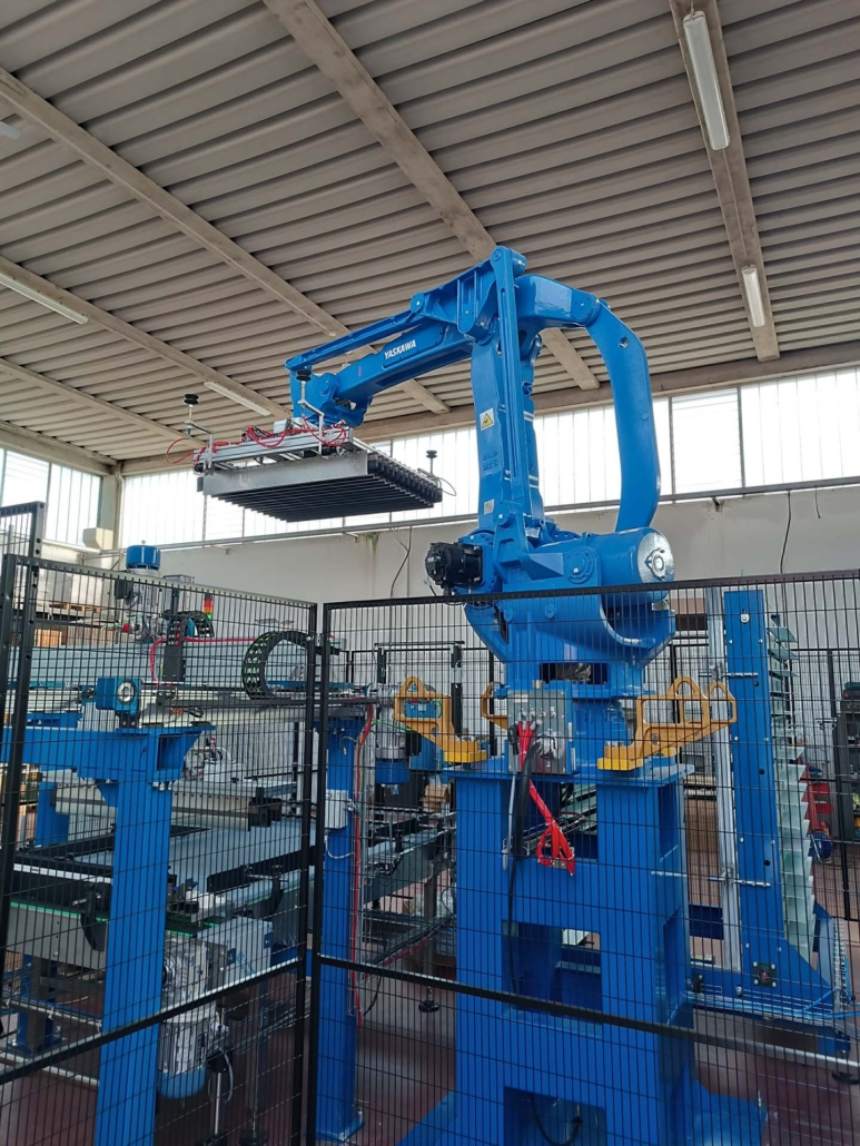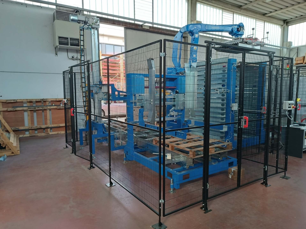 In questa occasione, la sinergia con un noto costruttore di impianti della Packaging Valley emiliana si è tradotta nella realizzazione di un’isola robotizzata per la palettizzazione automatica di bottiglie vuote in PET da 1 lt e 1,5 lt per olio alimentare su palette 800×1200 e 1000×1200, destinata ad un converter produttore di flaconi vuoti in plastica in Centro Italia.