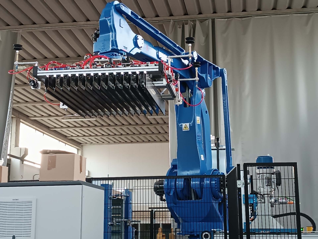 - testa di palettizzazione, montata su robot antropomorfo a 4 assi, atta al prelievo e deposito di uno strato di bottiglie vuote per ciclo tramite sistema a presa con tubi gonfiabili, e al prelievo e deposito di falde o vassoi mediante ventose;