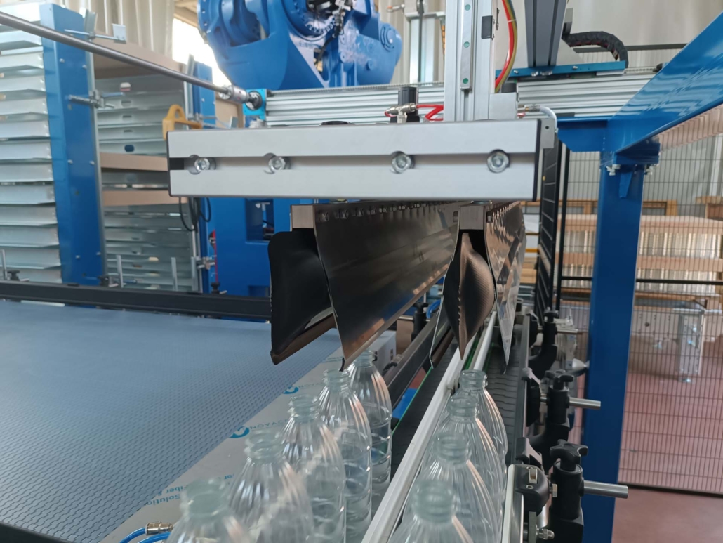 - stacker a presa di tipo “pick-&-place” con testa a 2 vie per il trasferimento e l’alimentazione delle file di bottiglie al tavolo di preparazione strato;