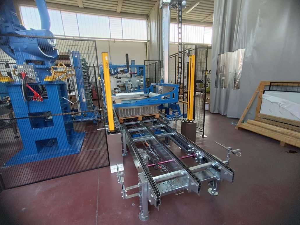 - trasportatori a catene motorizzate di ingresso palette vuote e uscita palette piene;