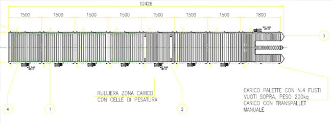 A motivo degli spazi inferiori molto ridotti, il controllo del moto delle rulliere sarebbe dovuto avvenire con motoriduttori installati lateralmente al trasporto. I fusti, una volta riempiti, si sarebbero dovuti spostare verso una zona di scarico – prelievo palette piene.