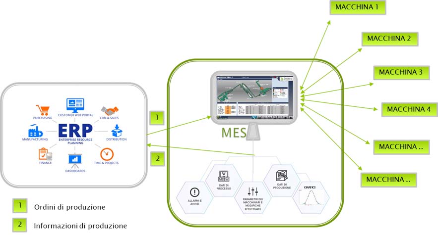 Bierre Automazioni realizza sistemi di supervisione MES (Manufacturing Execution System) conformi agli standard dell’Industria 4.0 per ottimizzare la gestione dell’esecuzione del processo di produzione del cliente in tempo reale, monitorando, tracciando, documentando e controllando l’intero processo produttivo, dalla materia prima al prodotto finito, e integrando le attività di produzione con la pianificazione aziendale, tipicamente gestita da un sistema ERP (Enterprise Resource Planning).